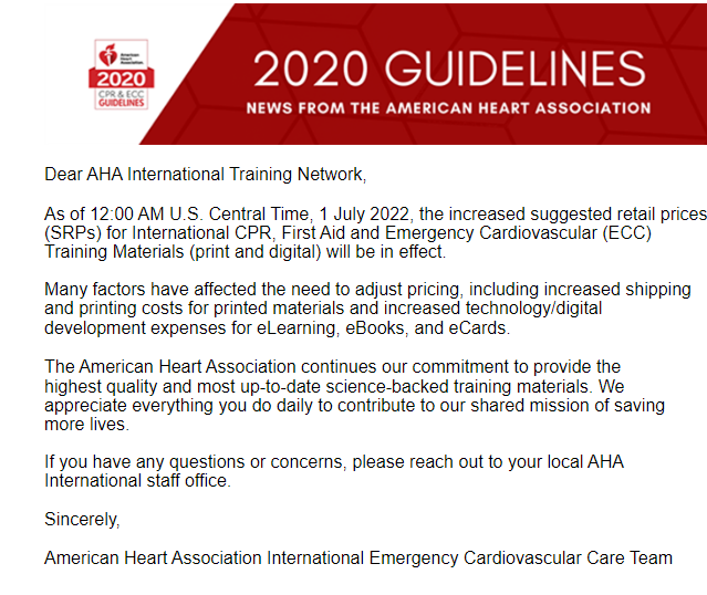 The American Heart Association has announced a price increase for ECC Training Materials effective July 1st, 2022.