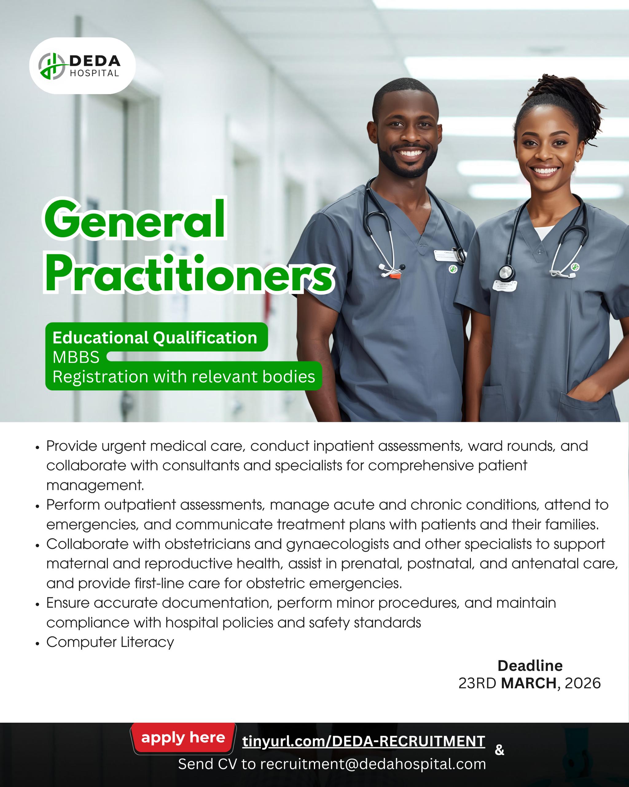 Interested and qualified candidates should send their CV to: [email protected] using "Consultant Family Physician – Benin" as the subject of the mail.