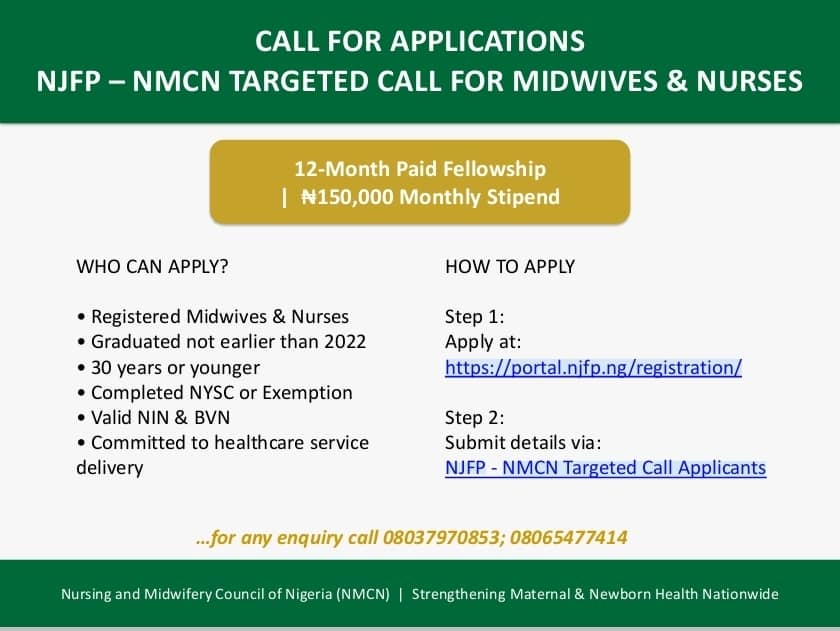 The Nursing and Midwifery Council of Nigeria (NMCN), in collaboration with the Nigeria Jubilee Fellows Programme (NJFP), invites qualified licensed Midwives and Nurses to apply for a 12-month paid fellowship placement in Primary Health Care Centres (PHCs) and General Hospitals across Nigeria.